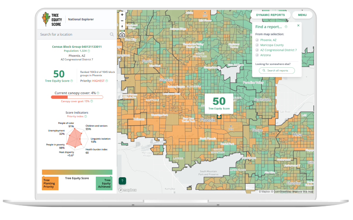 Our flagship tool makes Tree Equity Score available to all urban areas in the United States. Tree Equity Score sets a national standard to help make the case for investment in areas with the greatest need.